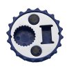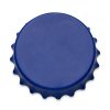Abridor de garrafa formato de tampa, em material plástico resistente com imã de geladeira. Parte traseira possui abridor tradicional e abridor para Long neck.