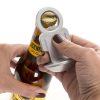 Abridor de garrafa no formato de homem em material plástico resistente com peso na base circular, possibilitando o movimento da peça.