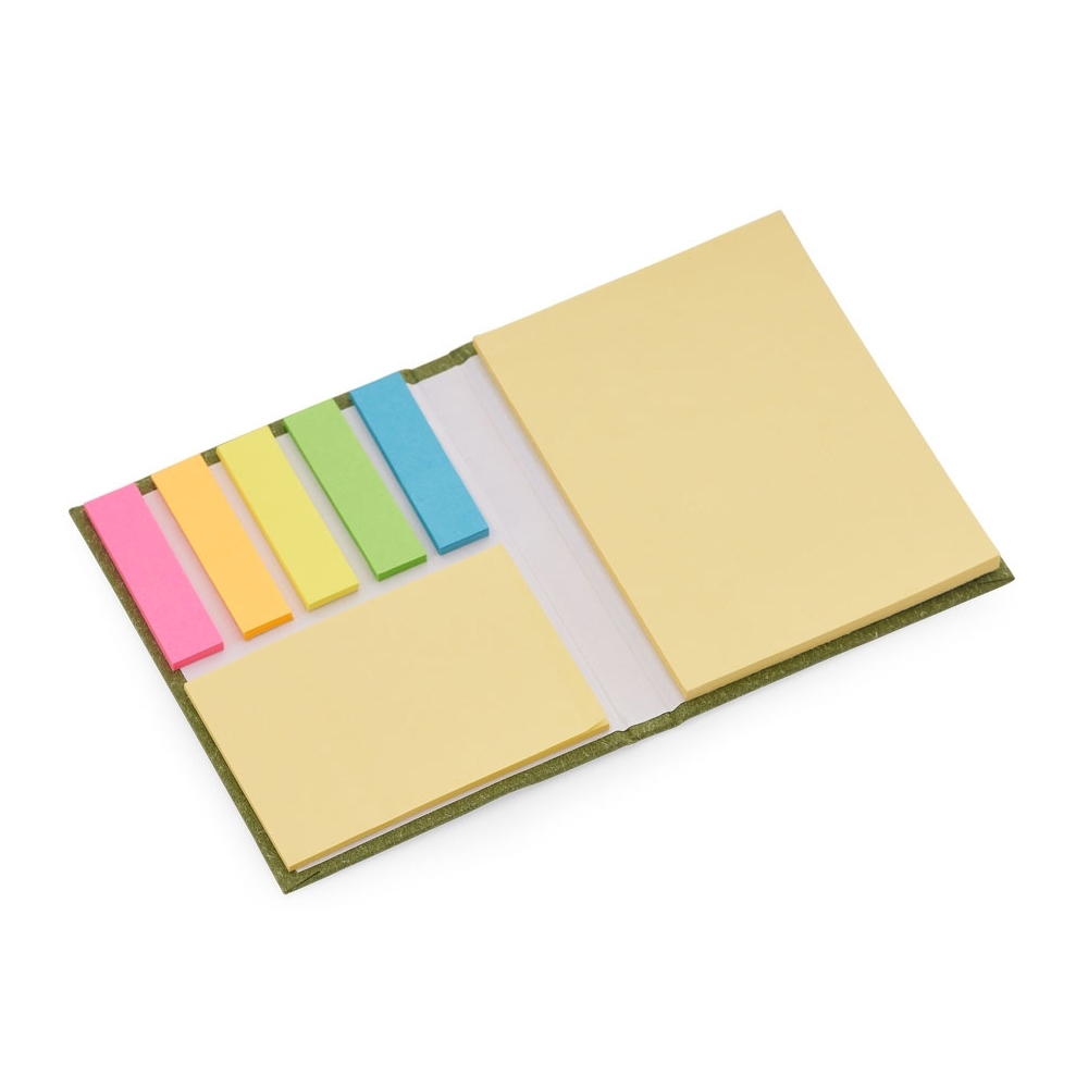 Bloco de anotações em kraft com autoadesivos coloridos. Capa de contorno pontilhado, possui cinco blocos coloridos autoadesivos com aproximadamente 25 folhas e dois blocos amarelos em tamanhos diferentes, ambos com aproximadamente 25 folhas cada.