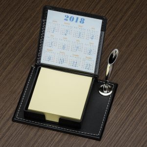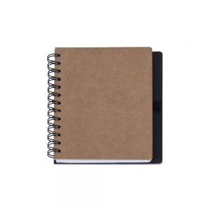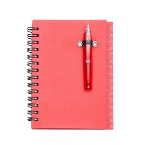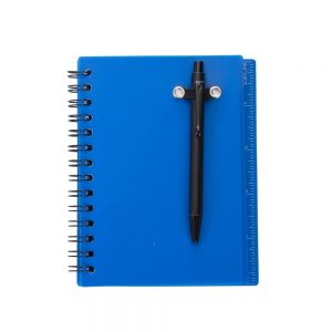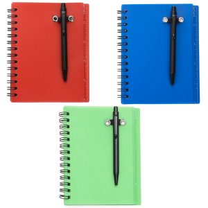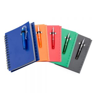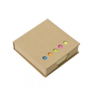 Bloco de anotações ecológico com autoadesivos e caneta de papelão, contém cinco blocos autoadesivos com aproximadamente 25 folhas e bloco com aproximadamente 70 folhas pautadas. Possui suporte de nylon para caneta e acompanha caneta de papelão com detalhes em plástico, carga esferográfica na cor azul e acionamento por clique.