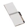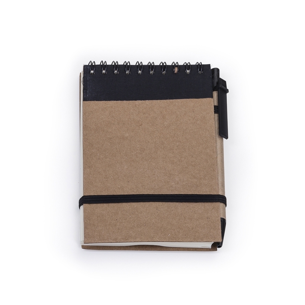 Bloco de anotações ecológico com caneta. Possui uma faixa superior com tecido colorido frontal e espiral preto, suporte elástico para caneta de papelão com clip e ponteira plástico e na parte inferior do verso há o símbolo/escrita recycle. Bloco com aproximadamente 70 folhas amareladas sem pauta.