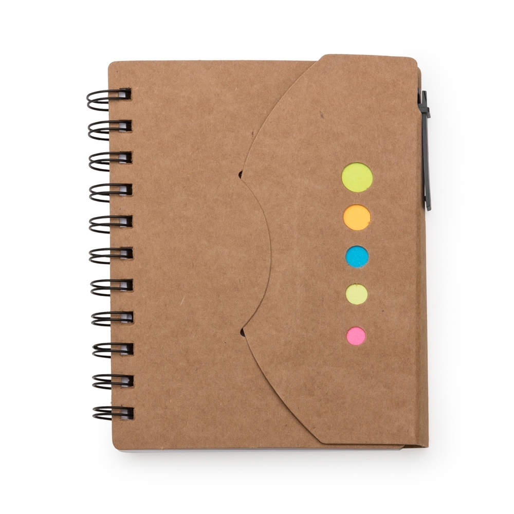 Bloco de anotações ecológico com caneta e autoadesivos coloridos. Bloco com fechamento lateral tipo “envelope e com espiral preto lateral. Possui cinco furos na capa referente aos blocos autoadesivos internos com 25 folhas cada, bloco com aproximadamente 70 folhas brancas pautadas e caneta de papelão de clip e ponteira plástica.