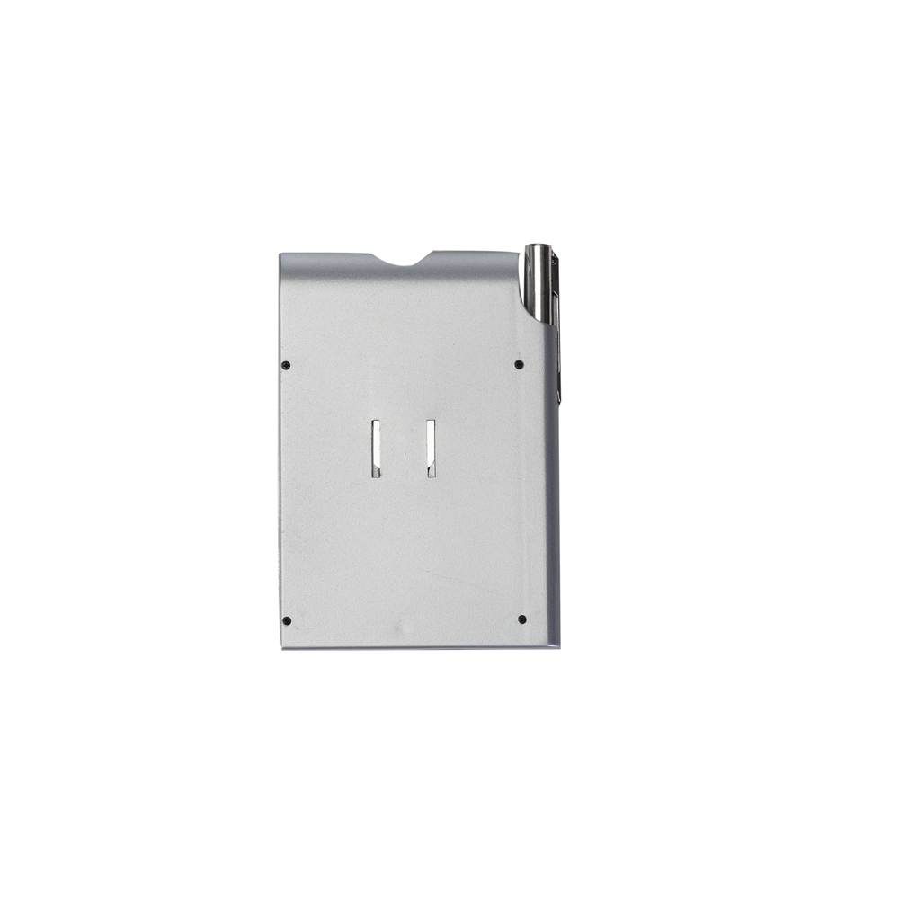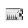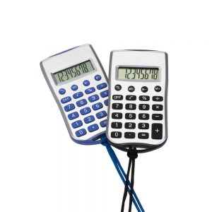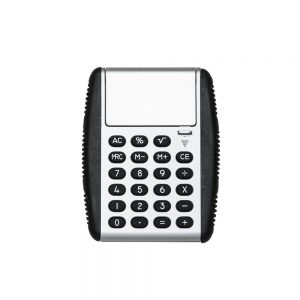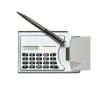 Calculadora Solar em plástico com 8 dígitos e porta cartão lateral. Acompanha caneta plástica prata com clip de metal na parte superior.