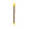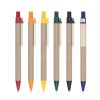 Caneta ecológica de papelão com detalhes coloridos. Clipe de madeira e ponteira em plástico, possui relevo na ponteira. Acionada por clique.