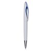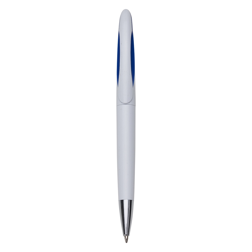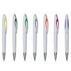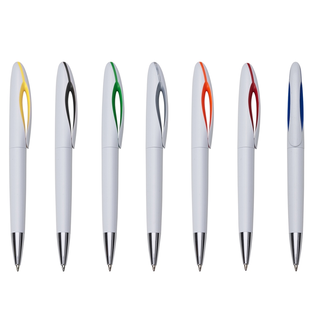 Caneta plástica branca com detalhe colorido. Possui Clipe em plástico com detalhe interno colorido, acionada por giro.