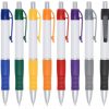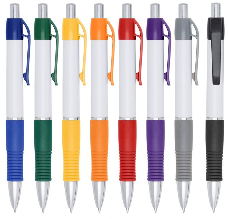 Caneta plástica com clipe com detalhe emborrachado, acionada por clique.