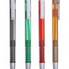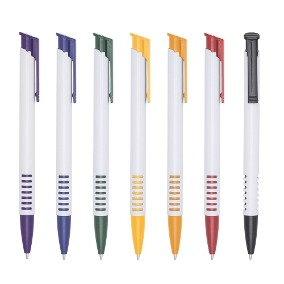 Caneta plástica com clipe e plástico translucido, acionada por clique.