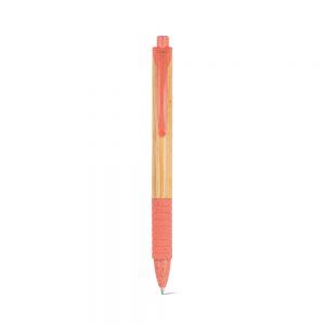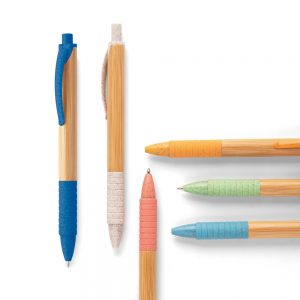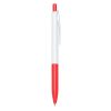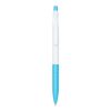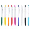 Caneta plástica branca com detalhes coloridos. Clipe plástico com detalhe vazado nas laterais, acionador e parte inferior colorida com oito anéis em relevo. Aciona por clique.