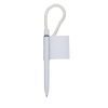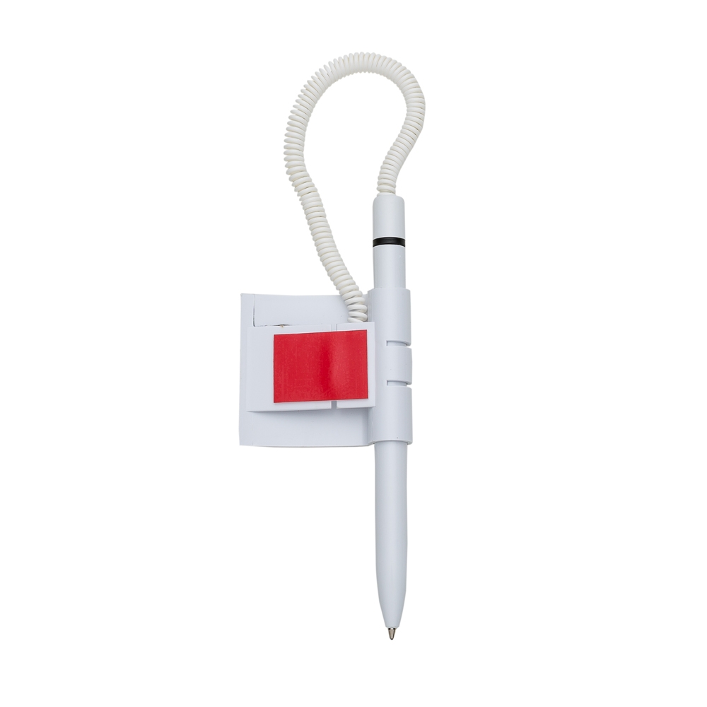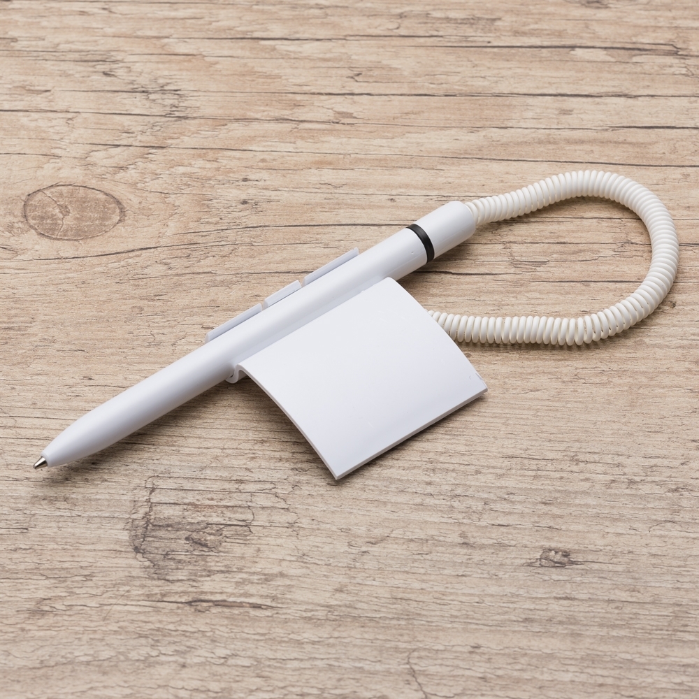 Caneta balcão plástica inteira branca com anel colorido. Possui suporte com adesivo auto-colante, ideal para fixar em balcão.
