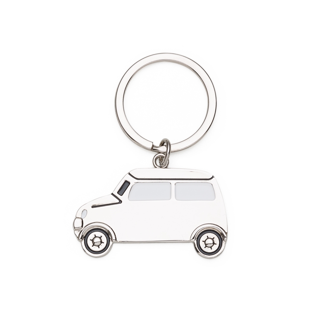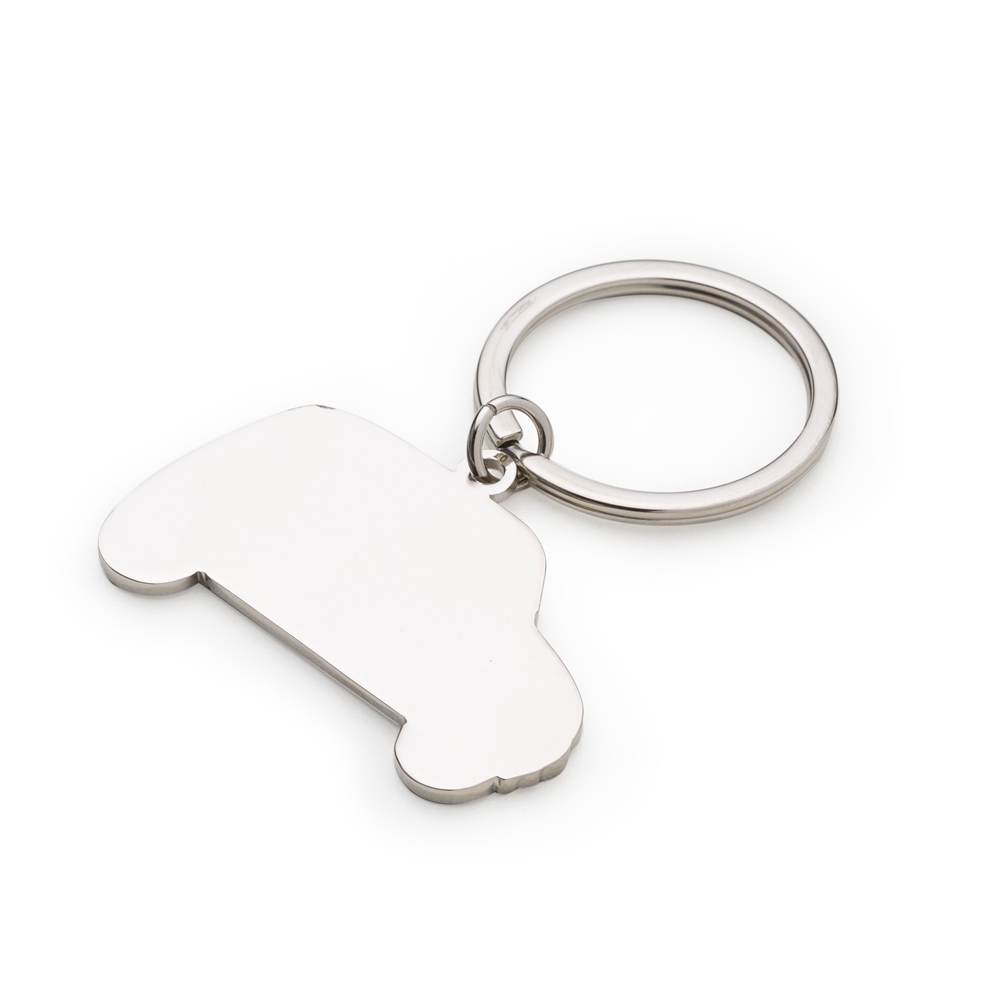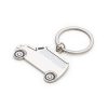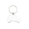 Chaveiro em metal no formato carro, frente com detalhes em branco e preto em relevo e verso brilhante liso.