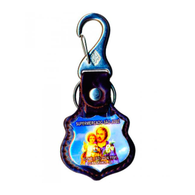 Chaveiro em couro no formato de brasão, Resinado e com mosquetão metálico.