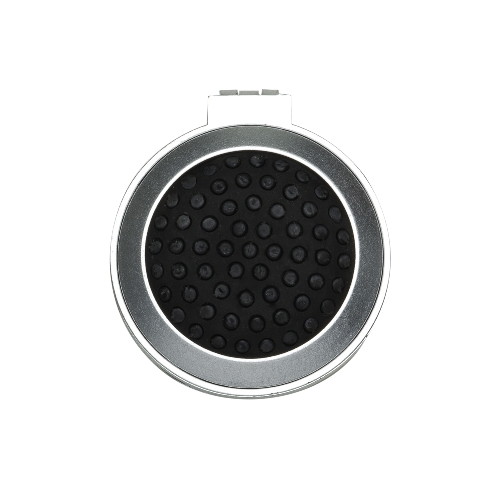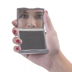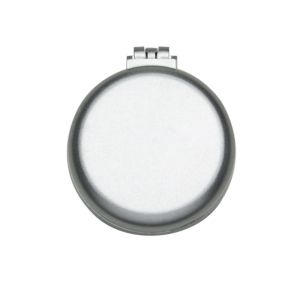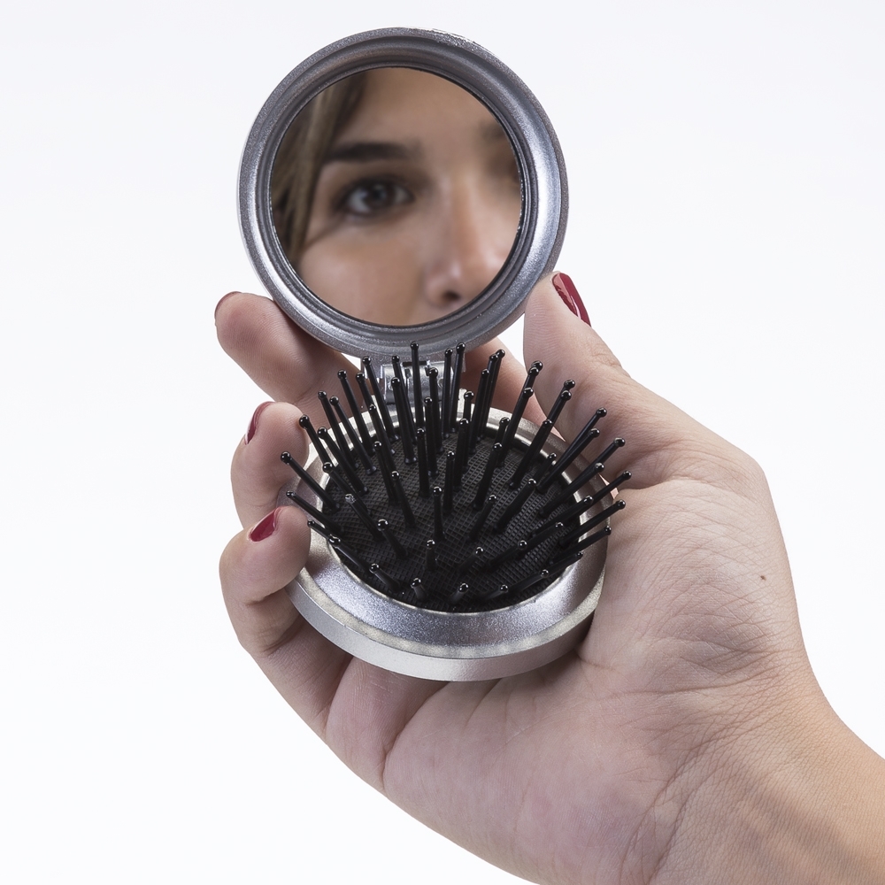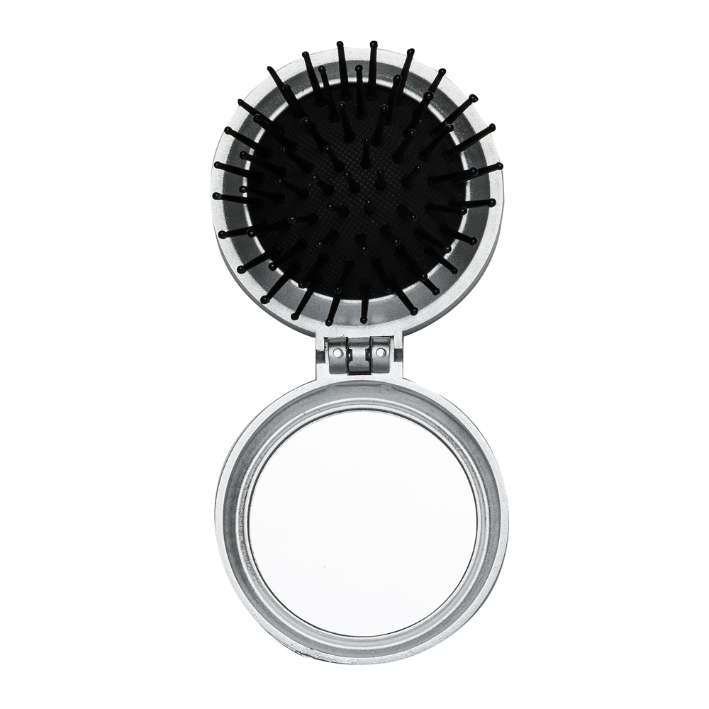 Escova redonda em plástico resistente com espelho. Parte superior plana e parte inferior emborracha com relevo, estando aberta a peça basta empurrar a parte emborrachada(lado de fora) para poder utilizar a escova.