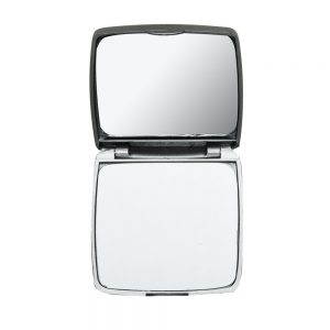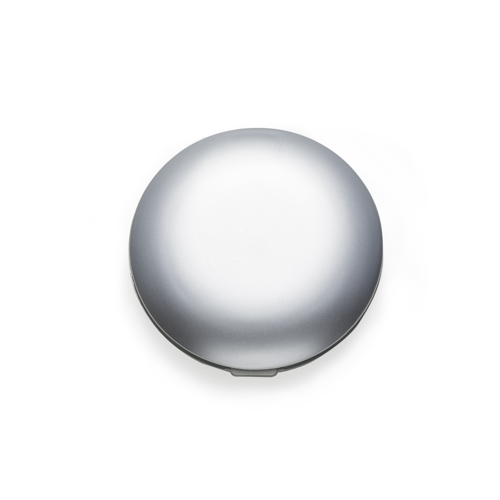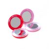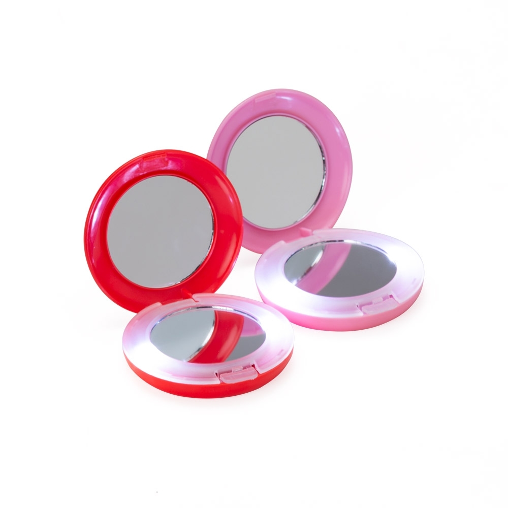 Espelho plástico redondo duplo com aumento e luz. Parte superior não é plana(apenas círculo central), verso com tampa aonde localiza-se as baterias(quatro baterias LR41). Possui luzes na lateral interna inferior.