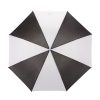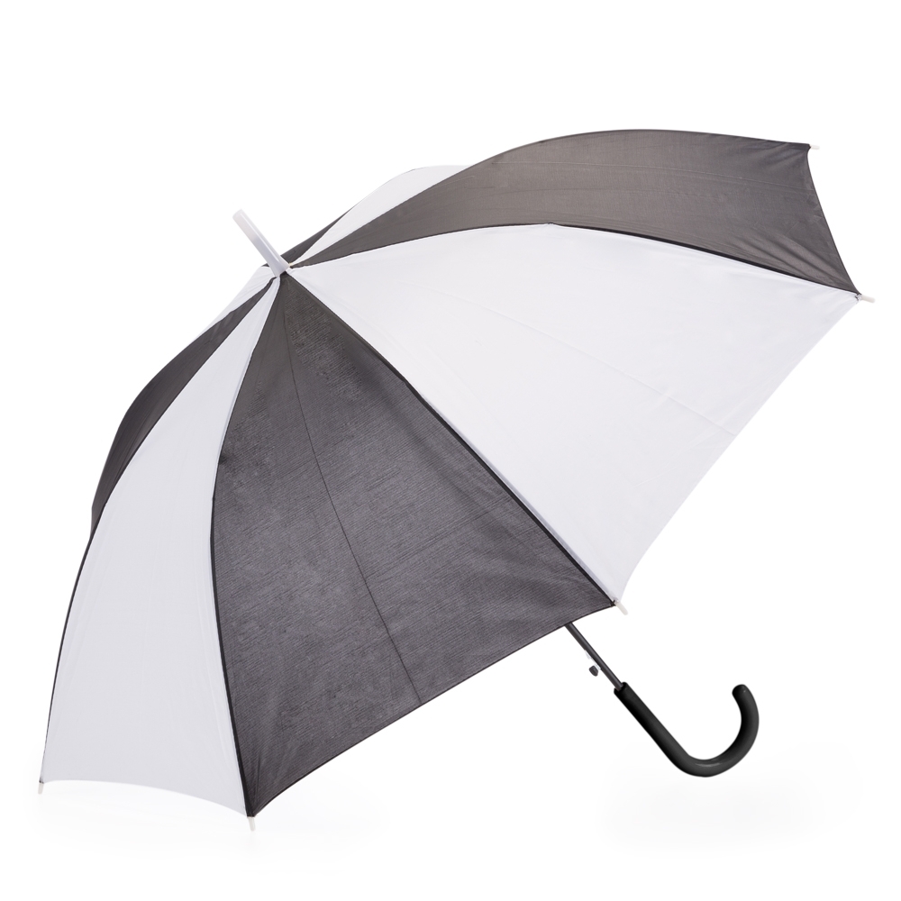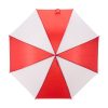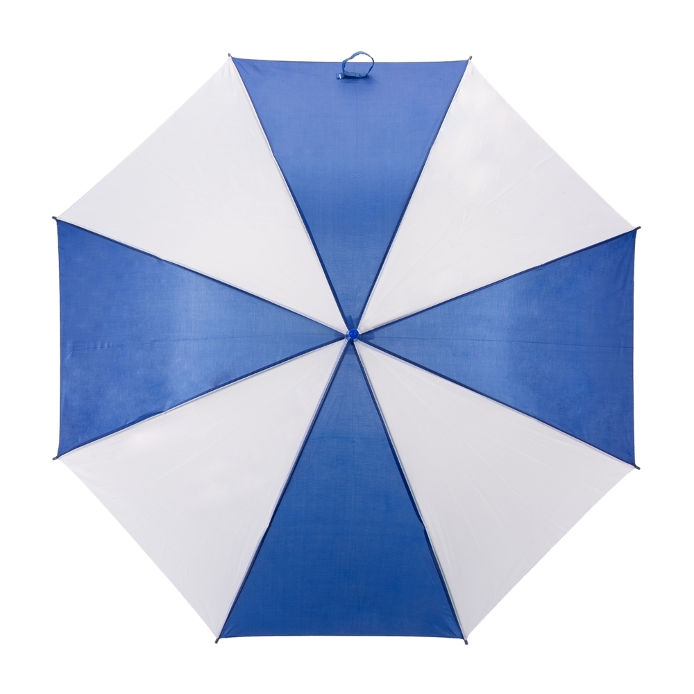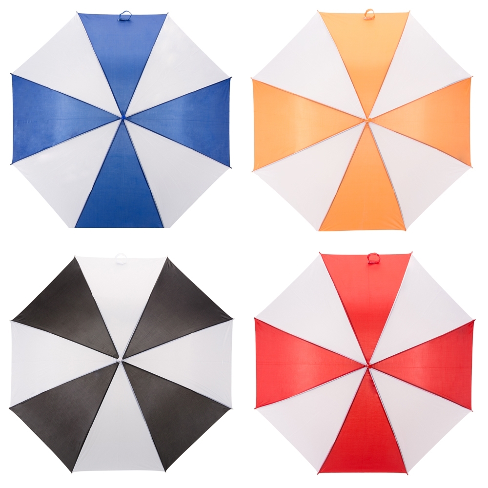 Guarda-chuva colorido com detalhes branco e tecido em nylon, basta acionar o botão inferior para abertura automática. Possui 8 varetas pretas de aço, pegador e bico superior de plástico.