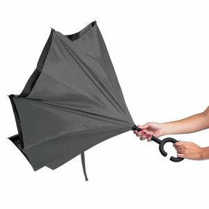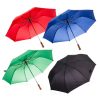 Guarda-chuva com cabo de madeira botão e acionador para abertura automática, armação reforçada de aço galvanizado, tecido Pongee chinês, seda crua poliéster e acompanha capa protetora.
