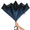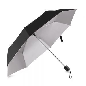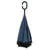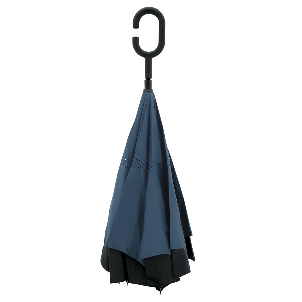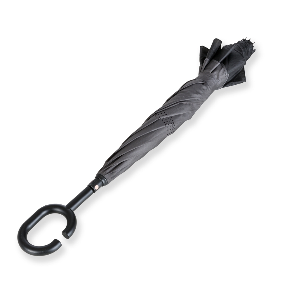 Guarda-chuva invertido com forro interno. Feito tecido nylon impermeável externo (preto) e interno (colorido), possui um mecanismo inovador que permite ao usuário não se molhar ao entrar e sair de ambientes devido sua abertura invertida, quando feito o movimento de fechar as varetas inverterão para cima criando um formato circular impedindo a chuva de alcançar o usuário, assim ele pode “segurar” a chuva enquanto entra/sai de um ambiente e depois basta virar o guarda-chuva para escorrer a água. Seu forro interno também serve para preservação das 8 varetas, evitando seu contato com a água e assim prolongando seu tempo de uso sem enferrujar. Ao impulsionar o fechamento invertido fica mais rápido e prático o modo de secar e ser guardado, pode ser apoiado no chão que permanecerá em pé para escorrer a água. Pegador plástico em formato C, botão acionador vermelho e fita com velcro para lacre.