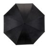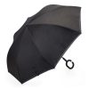 Guarda-chuva invertido com forro interno. Tecido em nylon impermeável preto, possui mecanismo inovador permitindo que o usuário não se molhe ao entrar e sair de ambientes devido sua abertura invertida, quando feito o movimento para fechar as varetas inverterão para cima criando um formato circular impedindo a chuva de atingir o usuário, podendo “segurar” a chuva enquanto entra/sai de um ambiente e depois virando o guarda-chuva irá escorrer a água. Forro interno para preservação das 8 varetas, evitando contato com a água e assim prolongando seu tempo de uso sem enferrujar. Ao impulsionar o fechamento invertido fica mais rápido e prático o modo de secar e ser guardado, pode ser apoiado no chão que permanecerá em pé para escorrer a água. Pegador plástico fosco em formato C, botão acionador vermelho e fita com velcro (contorno marrom) para lacre.