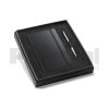 Kit de bloco de anotações e esferográfica. Cartão e alumínio. Em caixa almofadada. Incluso bloco de anotações e esferográfica.