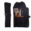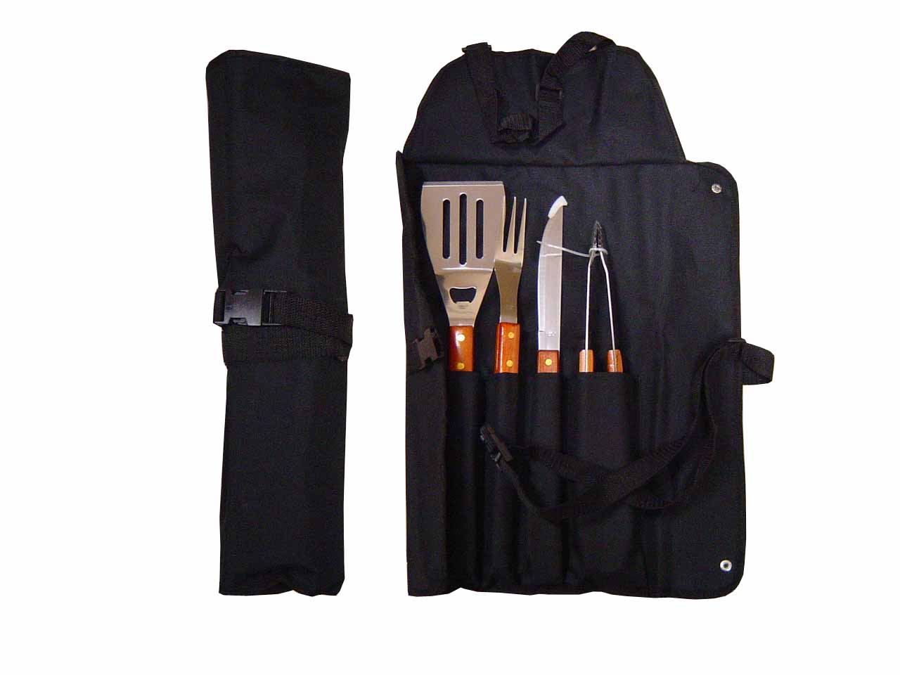Conteúdo: espátula, garfo, faca, pegador e avental (também utilizado como estojo). Talheres de inox com acabamento de madeira e avental de nylon com alça ajustável