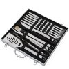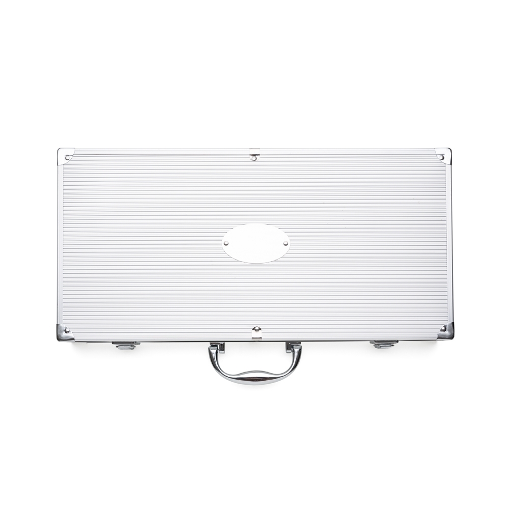 Kit churrasco com 17 peças em inox, acompanha maleta de alumínio com relevo e placa central para personalização. Parte interna revestida de tecido tnt e velcro para guardar as peças.