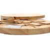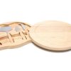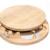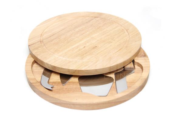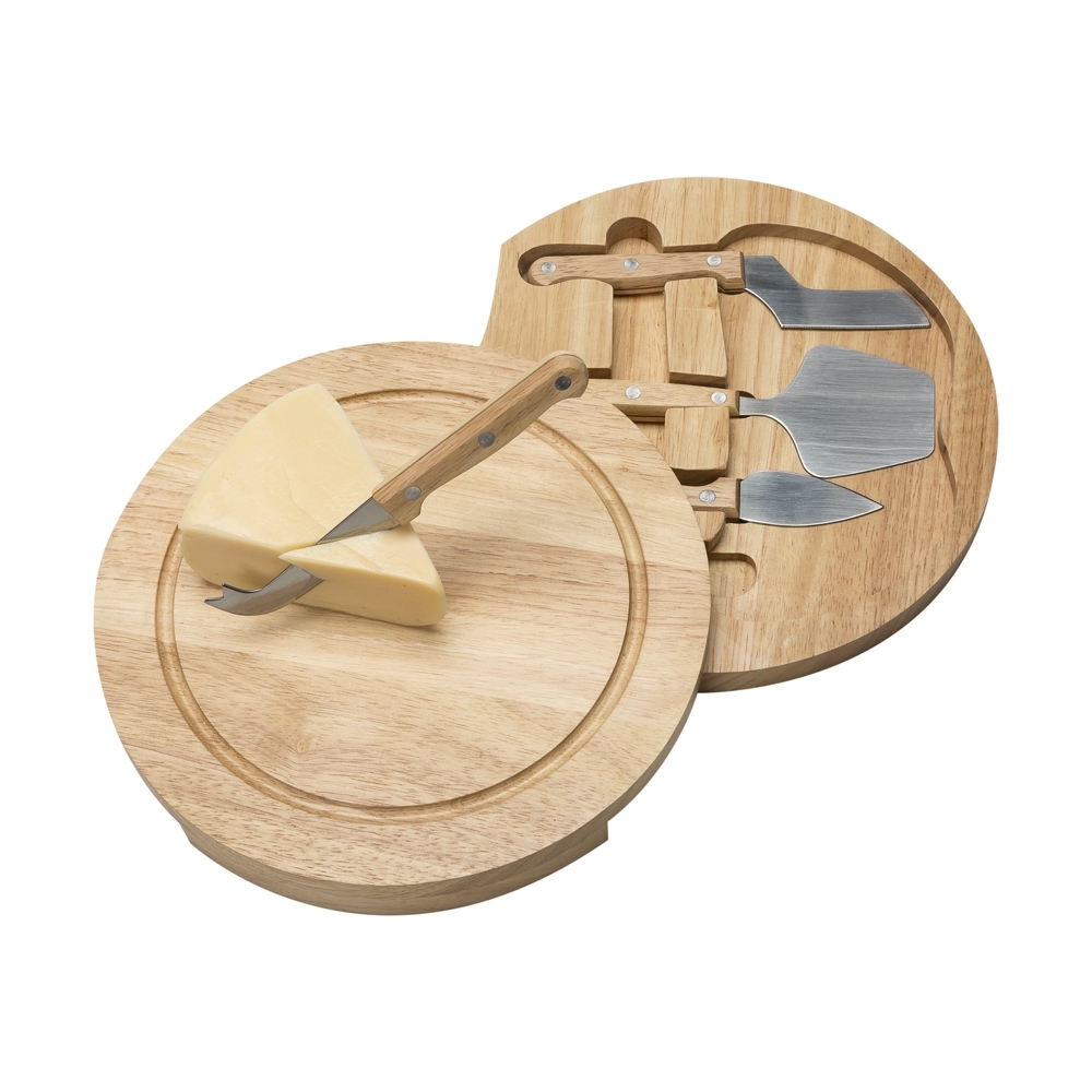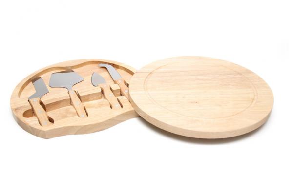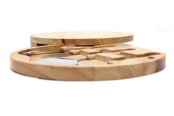 Kit queijo 5 peças, possui tábua de madeira com detalhe circular em relevo na parte superior e parte inferior com borrachas antideslizantes.