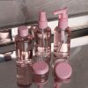 Conteúdo: frasco de 80ml com tampa spray, frasco de 80ml com tampa rosqueável, frasco de 80 ml com tampa pump, 2 potes de 10ml com tampa rosqueável e mini espátula fosca. Frascos plásticos e estojo em pvc com puxador plástico.
