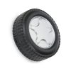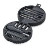 Kit ferramenta 20 peças com estojo formato pneu em plástico resistente. Pneu preto com aro prata, possui trava lateral.