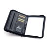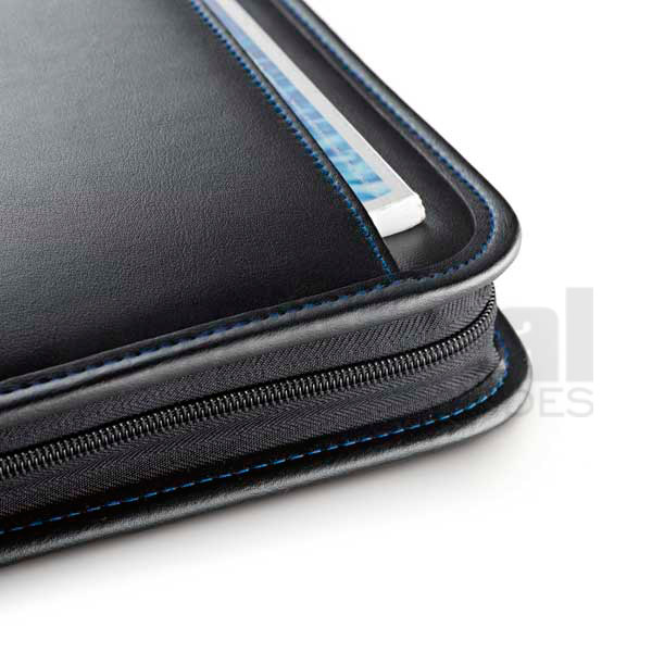 Pasta A4 em Couro sintético com Calculadora dual-power de 8 dígitos. Incluso pilha LR1130. Bloco: 20 folhas pautadas. Esferográfica não inclusa.