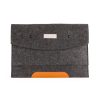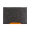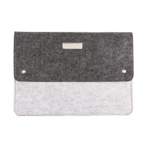 Pasta tipo envelope em feltro com forro e uma divisória, com detalhe inferior em couro sintético e dois botões pretos superiores. Acompanha placa metálica para personalização.
