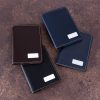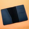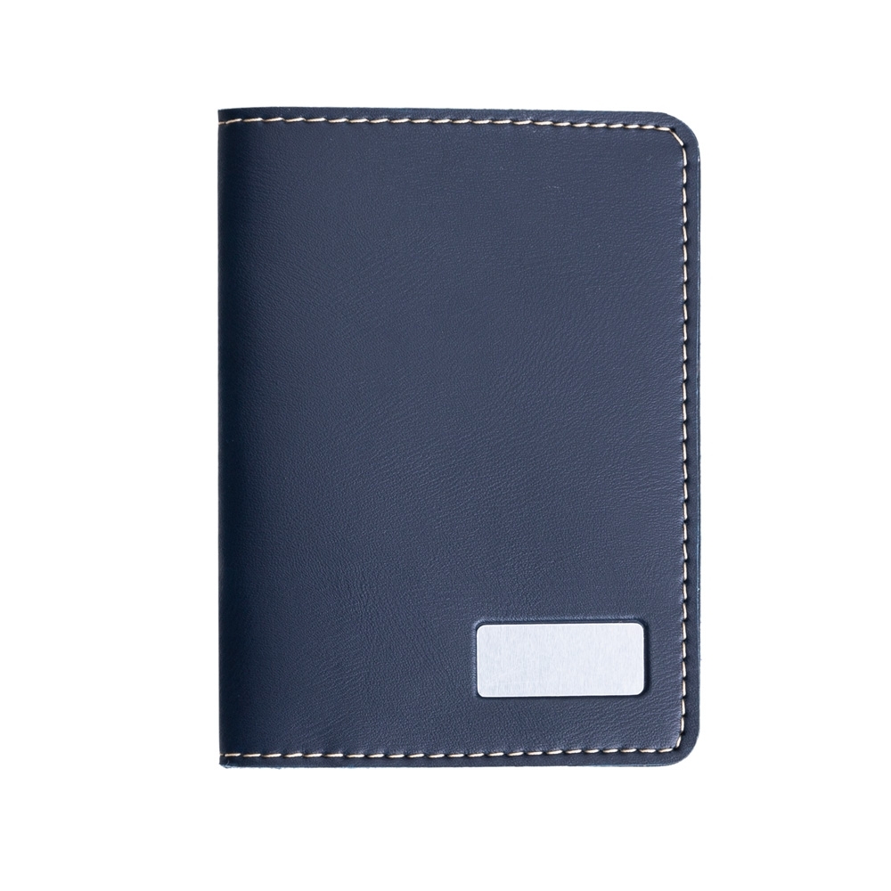 Porta passaporte Bidins em couro sintético brilhante com plaquinha metálica, parte interna com três compartimentos na lateral para cartões.